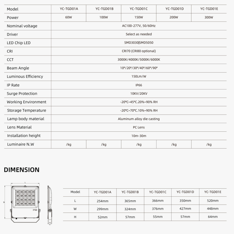 | YC-TGD01-50W | 358*294*52 | 50 وات | Heat sink Aluminum body,Glass,Bracket,304 screws, PCB، لنز. |